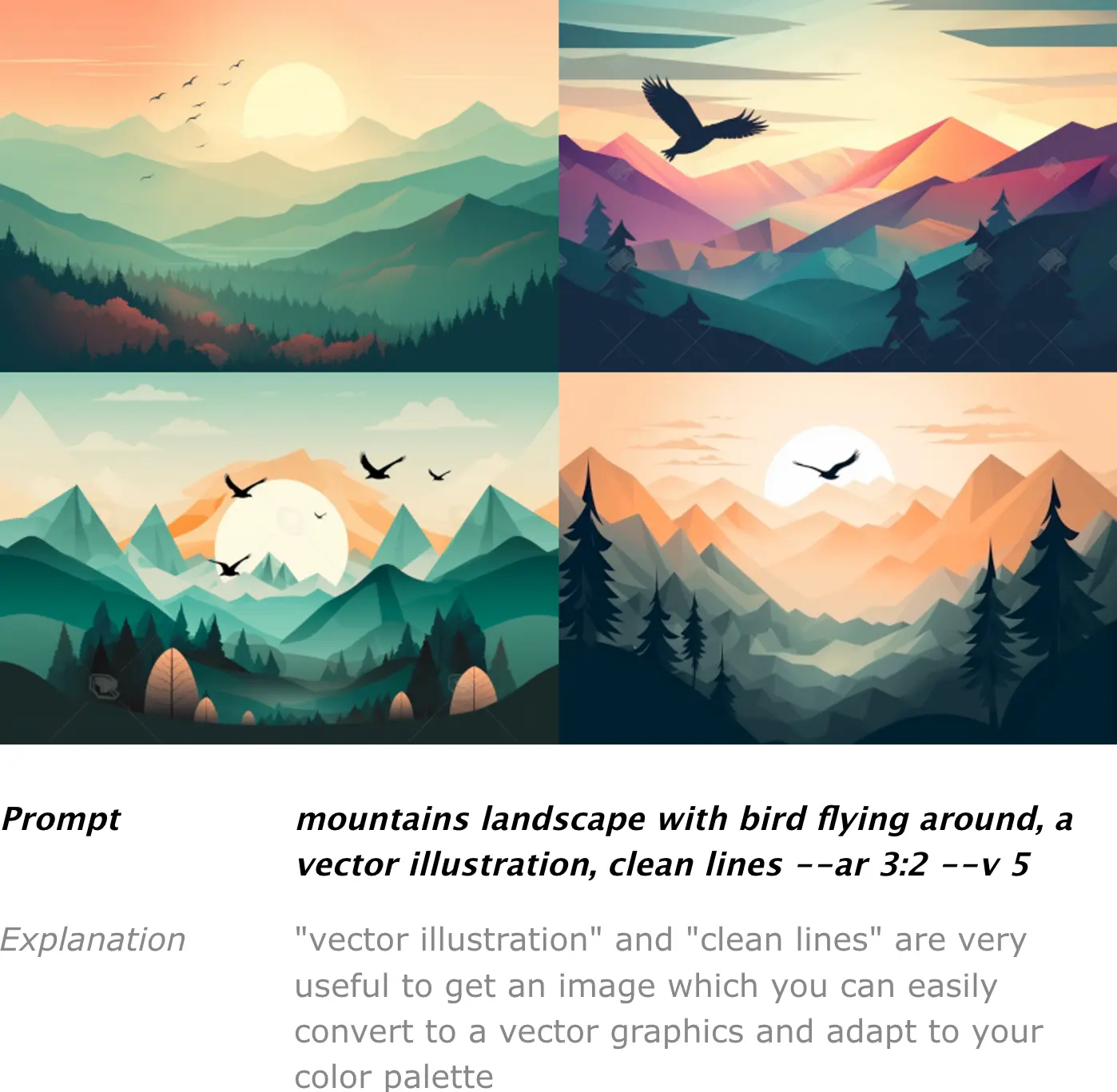 mountains landscape with bird flying around, a vector illustration, clean lines --ar 3:2 --v 5